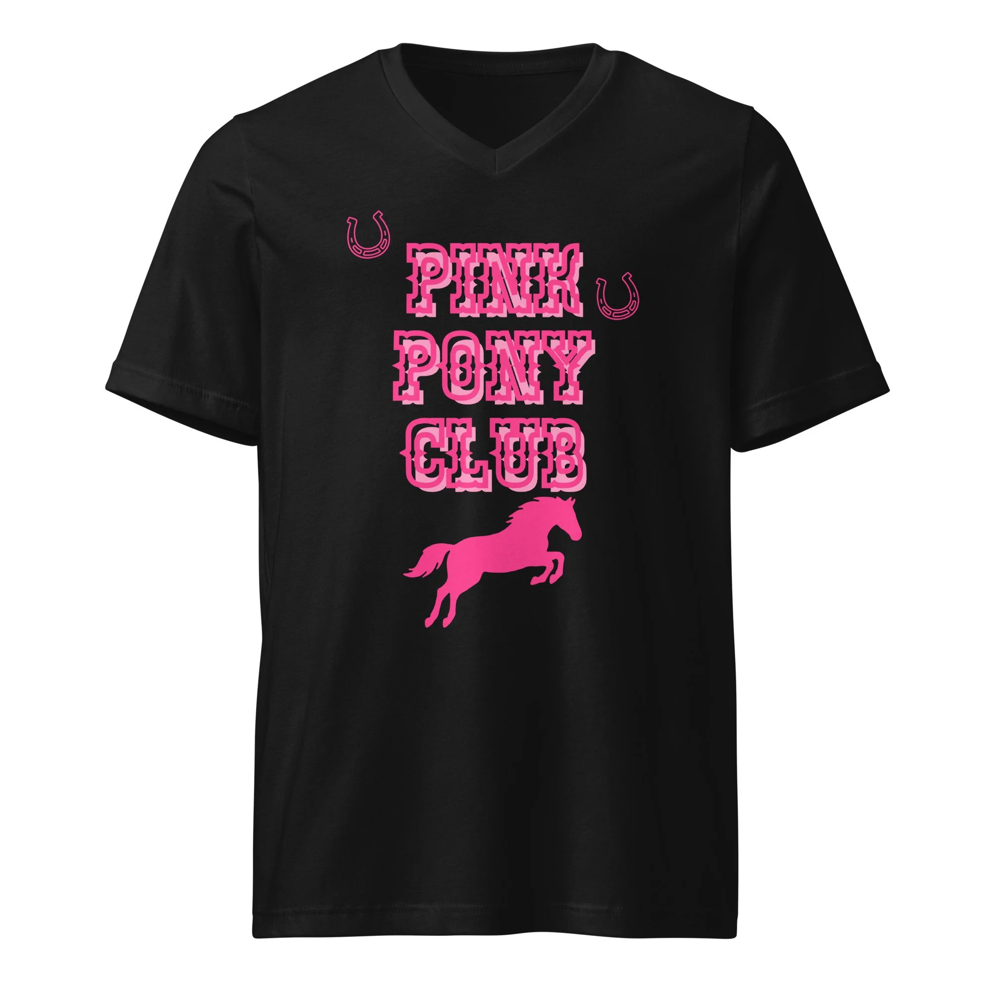 Equestrian Expressions Store › Pink Pony Club T-Shirt Image 1 of 4 Image 2 of 4 Image 3 of 4 Image 4 of 4 Pink Pony Club T-Shirt from $30.00 This unisex tee has a classic v-neck cut and fits like a well-loved favorite. • 100% combed ring-spun cotton • Dark Grey Heather is 52% Airlume combed ring-spun cotton, 48% polyester • Athletic Heather is 90% combed and ring-spun cotton, 10% polyester • Pre-shrunk fabric • Fabric weight: 4.2 oz/yd² (142 g/m²) • Regular fit • Side-seamed construction • Coverstitched v-neck and hemmed sleeves • Shoulder-to-shoulder taping • Blank product sourced from Nicaragua, Guatemala, or the US Size: Select Size S M L XL 2XL Add To Cart Added! This unisex tee has a classic v-neck cut and fits like a well-loved favorite. • 100% combed ring-spun cotton • Dark Grey Heather is 52% Airlume combed ring-spun cotton, 48% polyester • Athletic Heather is 90% combed and ring-spun cotton, 10% polyester • Pre-shrunk fabric • Fabric weight: 4.2 oz/yd² (142 g/m²) • Regular fit • Side-seamed construction • Coverstitched v-neck and hemmed sleeves • Shoulder-to-shoulder taping • Blank product sourced from Nicaragua, Guatemala, or the US